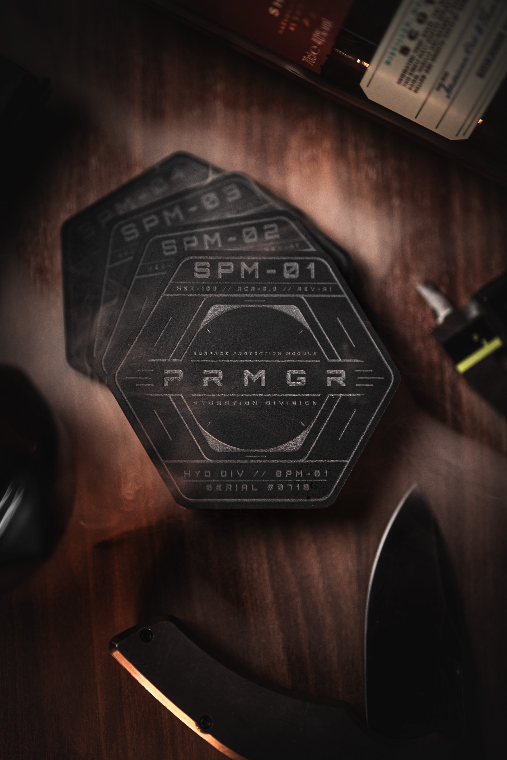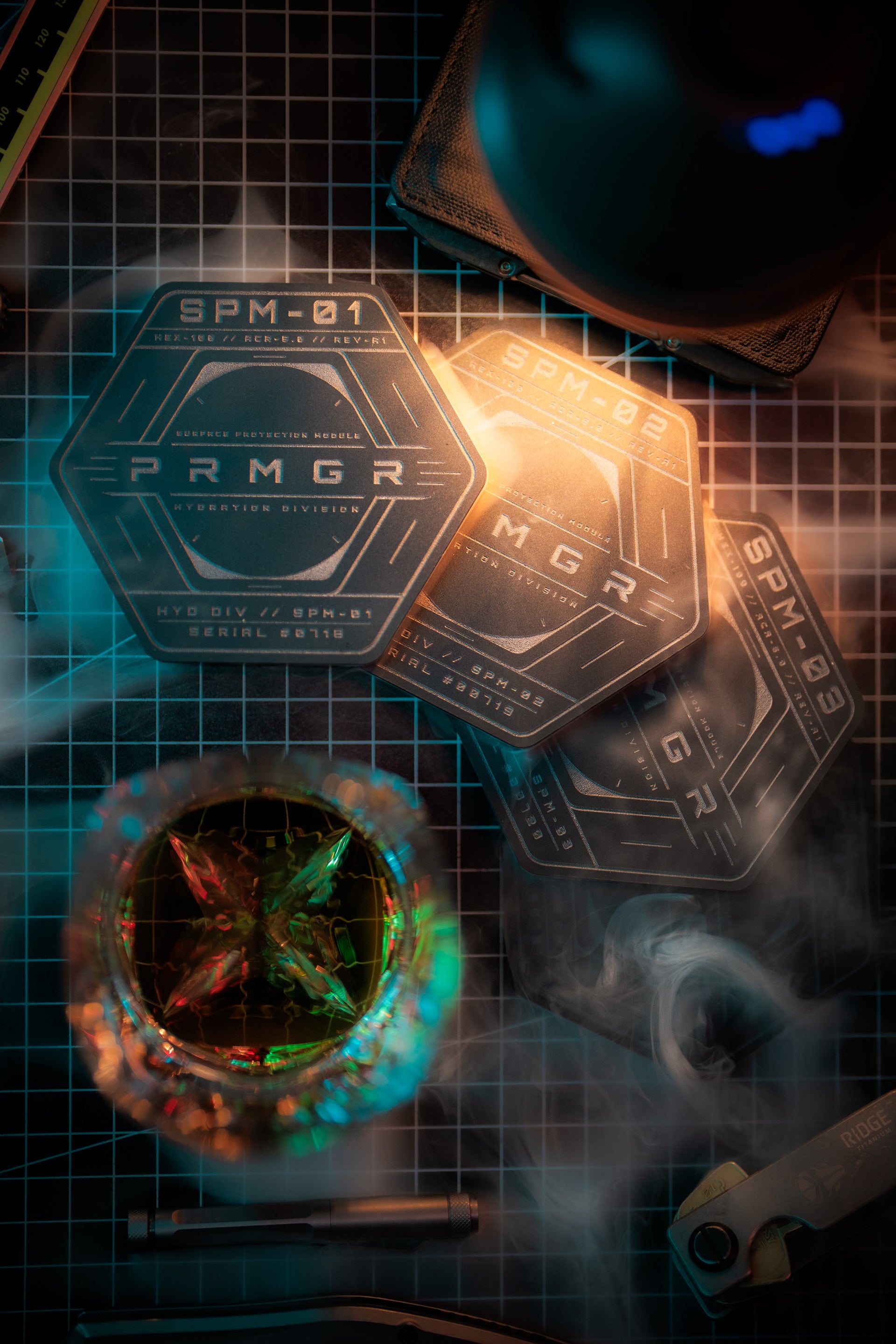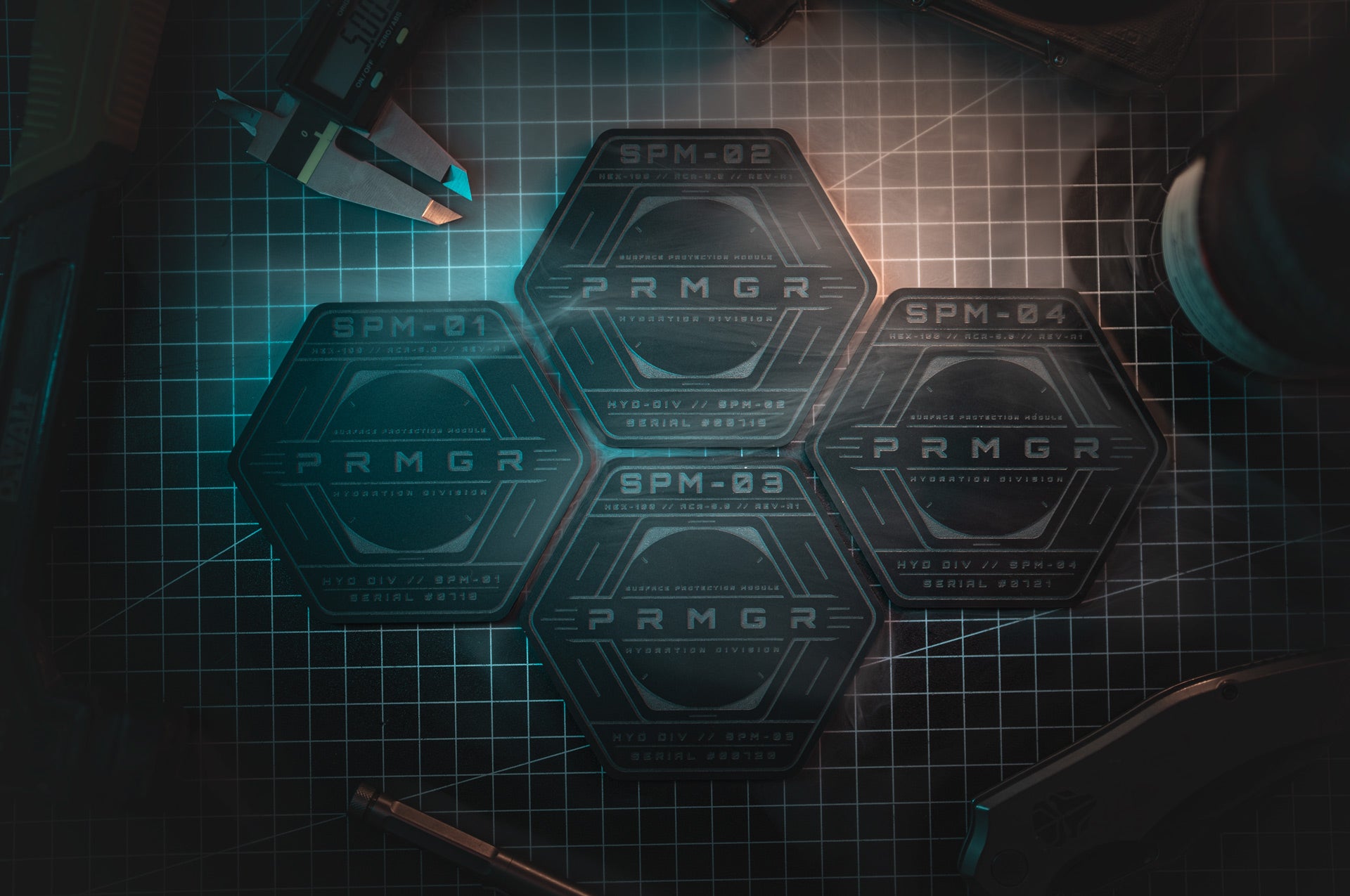 The hexagonal geometry echoes industrial hardware, tactical components and the systematic design language that runs through the entire PRMGR ecosystem.