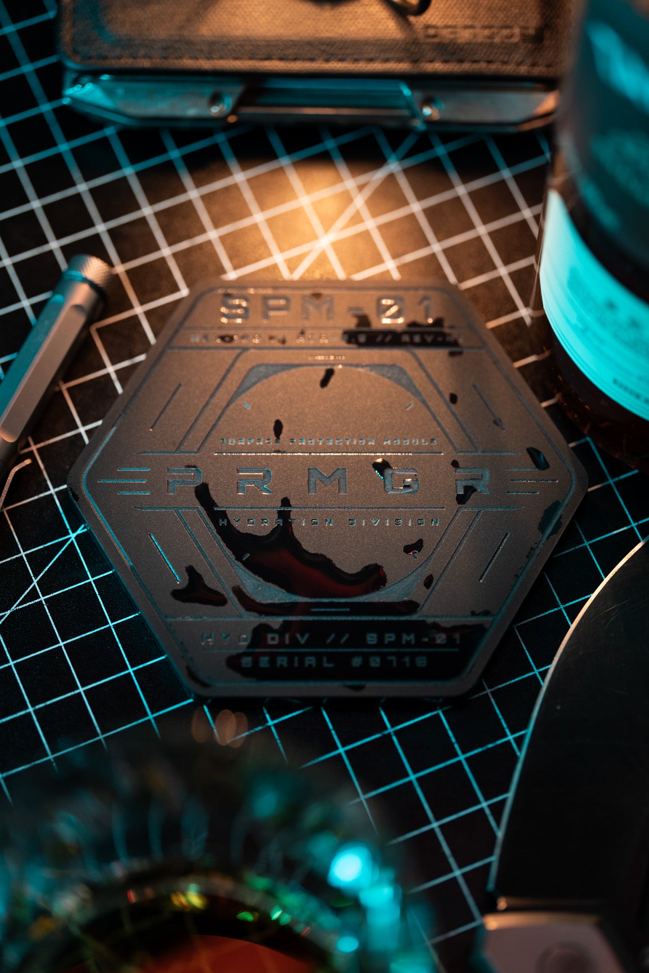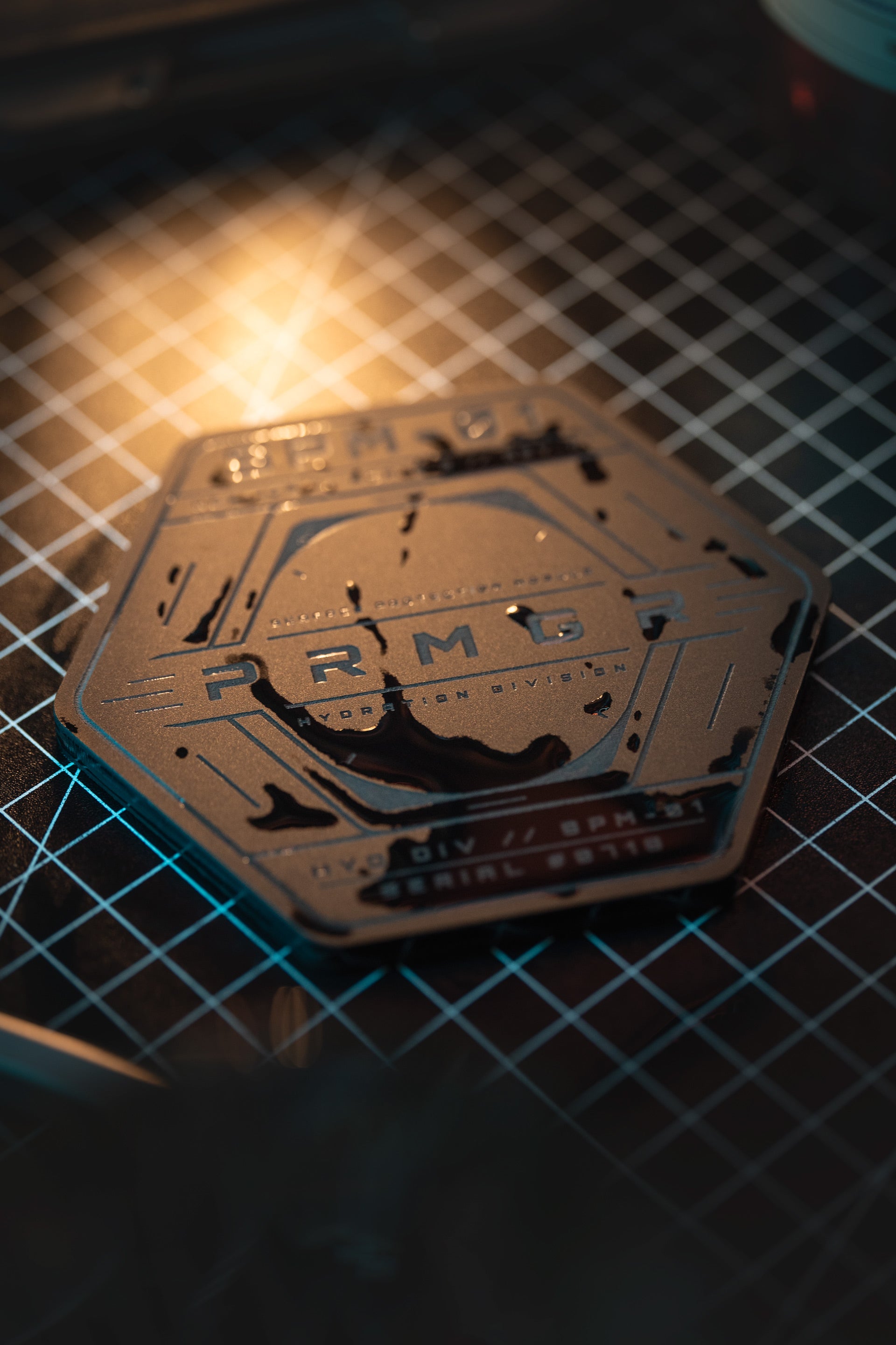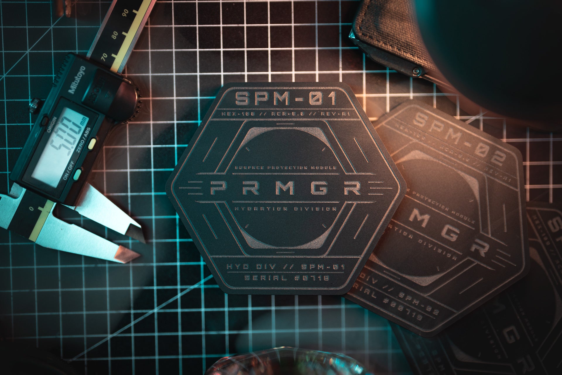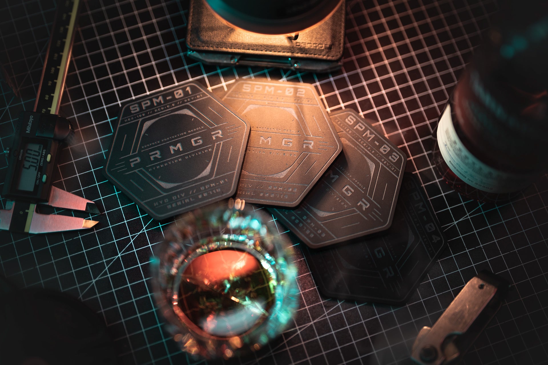 The hexagonal geometry echoes industrial hardware, tactical components and the systematic design language that runs through the entire PRMGR ecosystem.